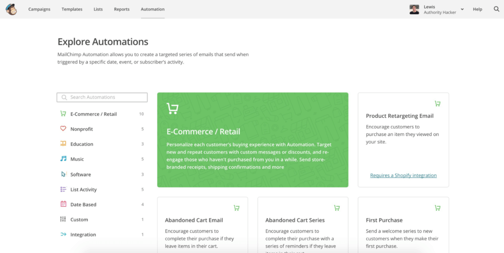 MailChimp offers a bunch of what they call, “workflow recipes”, which give you common a pre-made automation framework to build from, instead of having to start from scratch.